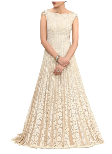 Rock your cocktail night wearing this linear panel lazer cut ivory italian stretch floor length gown. It features crystal highlights on the lazer cut panels. Team it up with a delicate diamond necklace to complete the royal look.