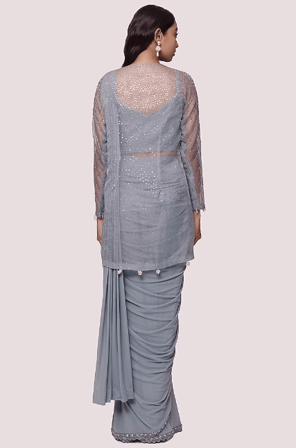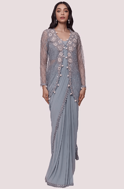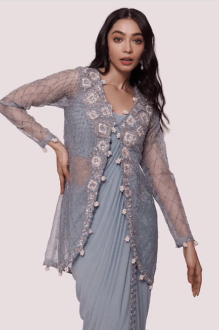 Featuring a light blue pre-stitched saree in lycra net base with embellishments. It is paired with a matching blouse and a jacket having sequins, pearl, and cutdana embellishments.