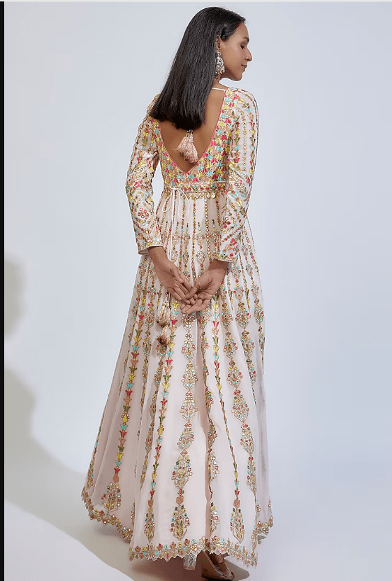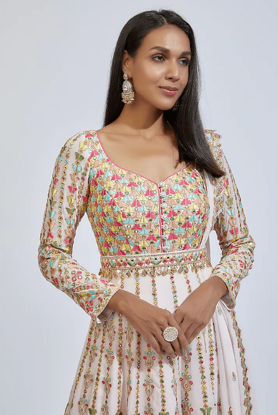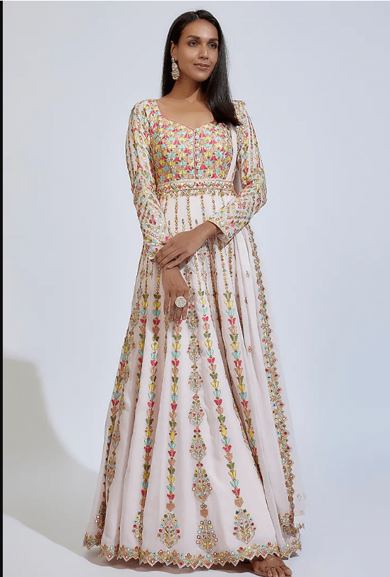 Featuring a light pink anarkali in georgette base with resham, gota, dori, mirror, and foil embroidery. It is paired with a matching dupatta and a belt.