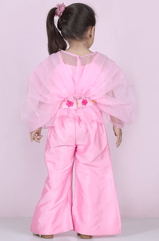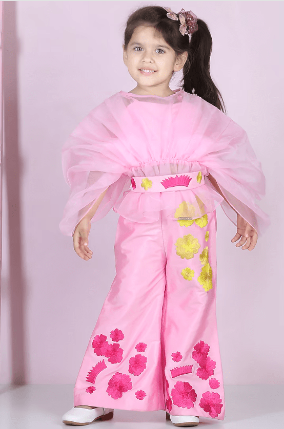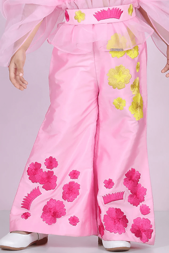 Featuring a light pink pleated top for girls in organza base. It is paired with matching silk embroidered pants.