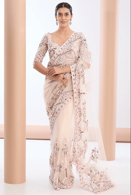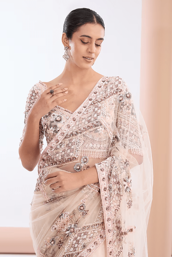 Featuring a light pink saree in tulle net and crepe base with crystal embroidery. It is paired with an embroidered blouse. Accentuate it with statement jewellery and heels for a wedding or sangeet ceremony.