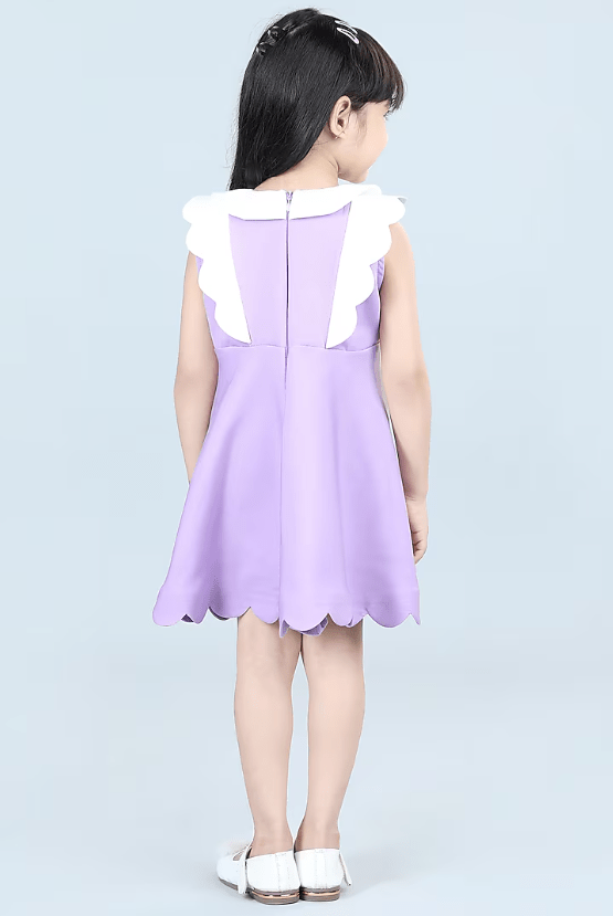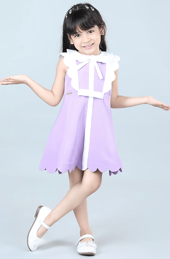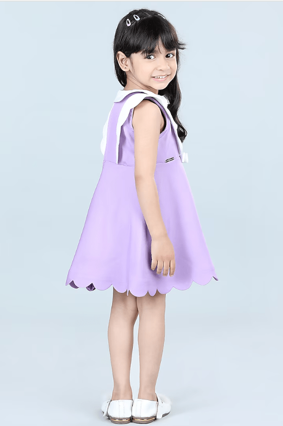 Featuring a lilac dress for girls in imported crepe base with scalloped detailing and a bow. Accessorize this designer dress with sandals and a cute hair accessory for any special occasion, birthday party or event.