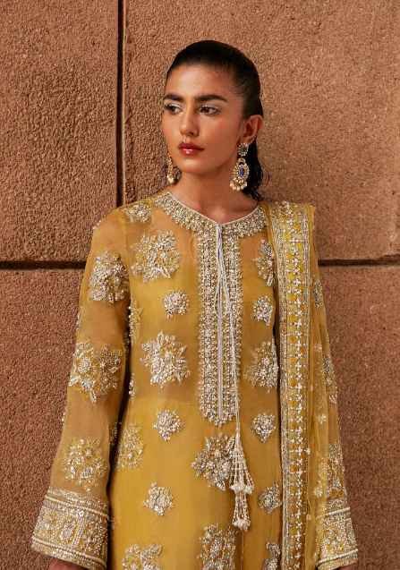 This silhouette brings a modern charm to your wardrobes with its pastel lime yellow color, composed with cross stich floral motifs all over and with distinctive daman borders. Further it features velvet palazzo with color block embellished border and with net dupatta composed with pearl spray and with heavy embellished four side borders.