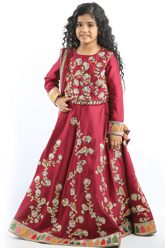 Featuring a maroon lehenga for girls in chanderi base with floral, sequins and cutdana machine embroidery. It is paired with a blouse and a net dupatta. Style it with sandals and hair accessories for a festive occasion or wedding ceremony.