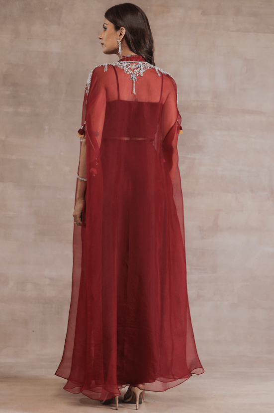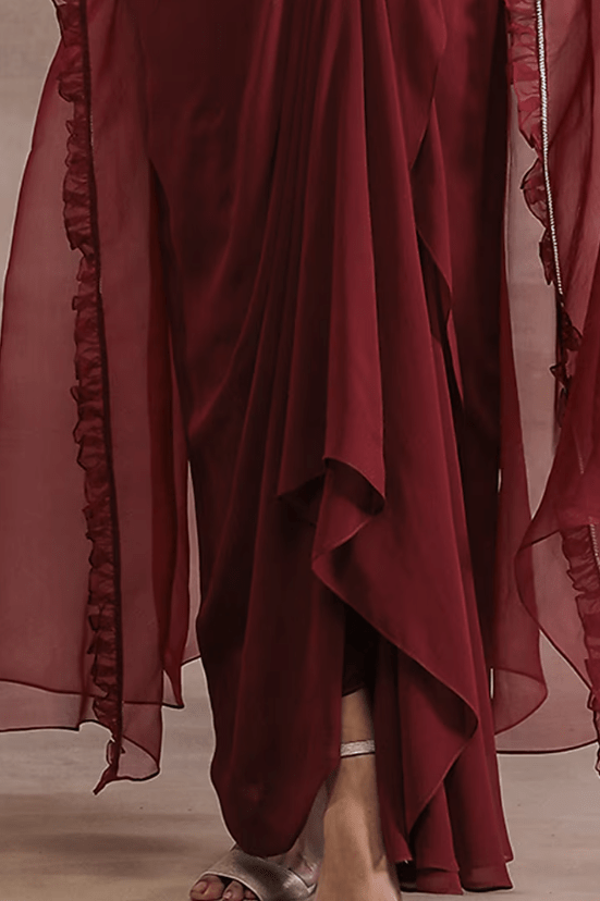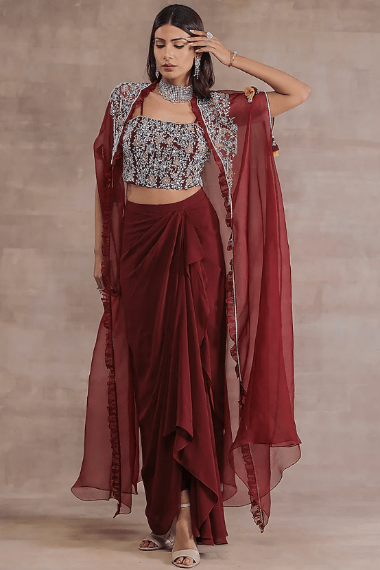 Featuring a maroon cami top in georgette base with patch work, glass beads, crystals and sequins hand embroidery. It is paired with a matching organza cape and a draped skirt.