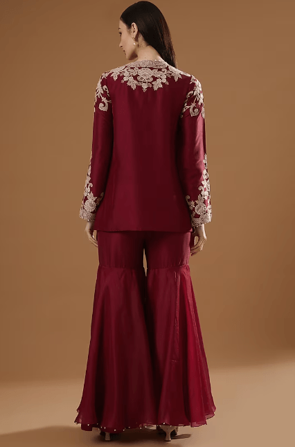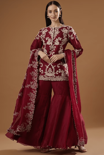 Featuring a maroon short kurta in dupion base with lace, jaal, thread and pearl work. It is paired with matching organza gharara pants and an organza butterfly dupatta having pearl work.