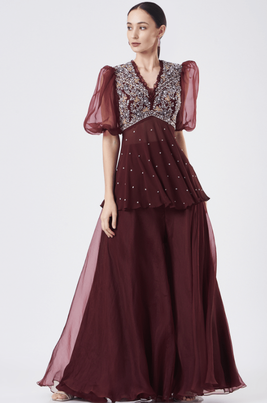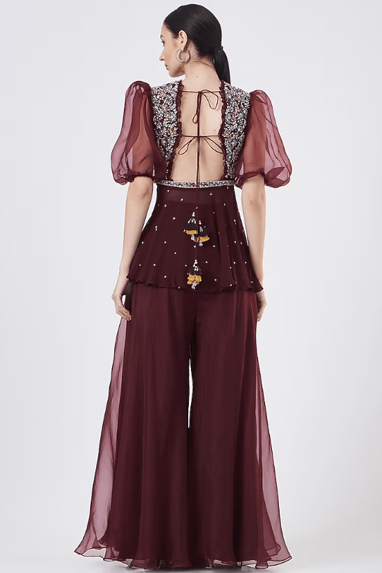Featuring a maroon peplum top in georgette base with puffed sleeves and pom-poms. It is paired with matching organza flared pants.