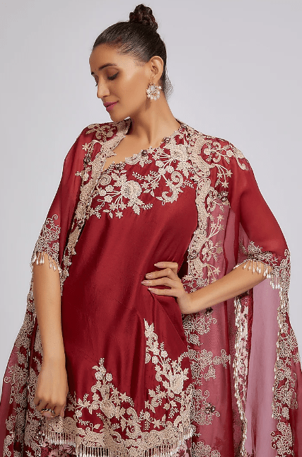 Featuring a maroon off-shoulder kurta in dupion base with thread and pearls work. It is paired with matching organza sharara pants and a cape.