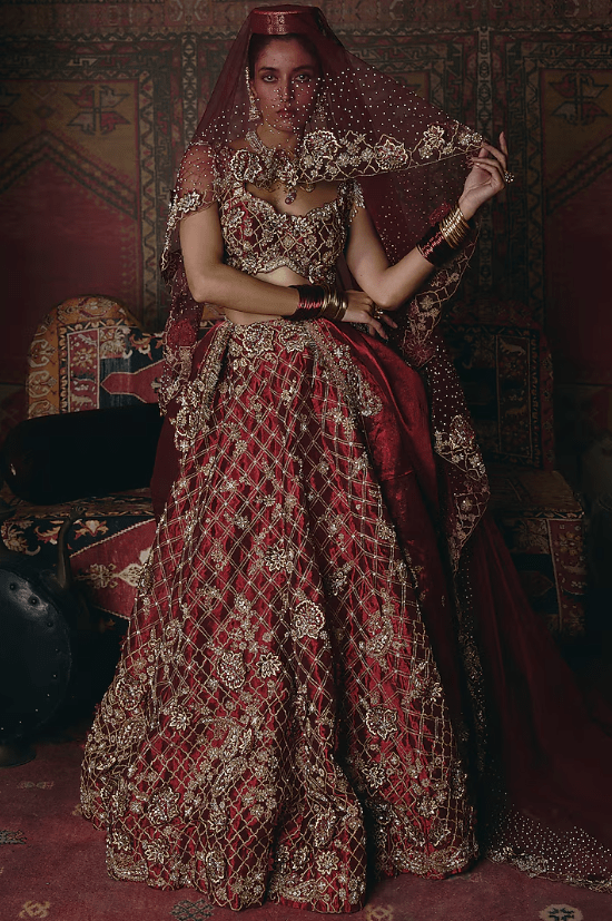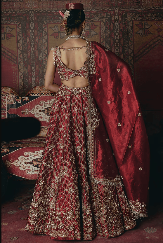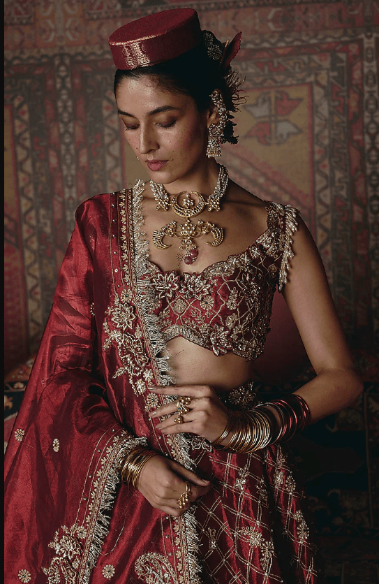 Featuring a maroon lehenga in pure tissue base with 3D floral embroidery. It is paired with an embroidered blouse and a dupatta. Accentuate it with statement earrings, a sleek low bun, and metallic heels for a dramatic ensemble, ideal for sangeet nights or glamorous celebrations.