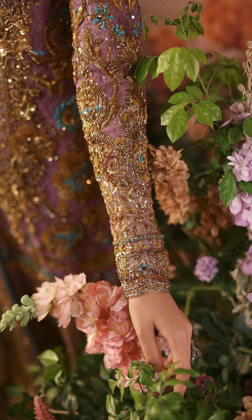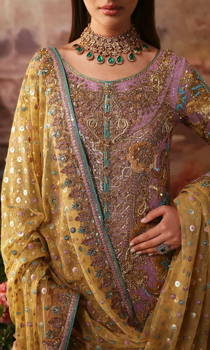 A mauve long shirt paired with an ezaar, showcasing intricate craftsmanship of resham accents in gold and turquoise hues. Complete with a contrast and embellished dupatta for a chic formal look.