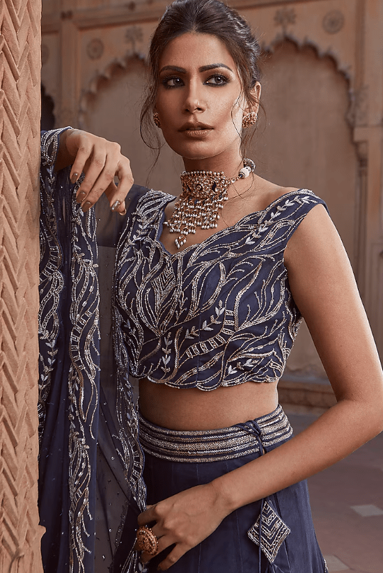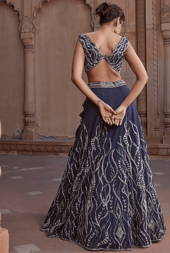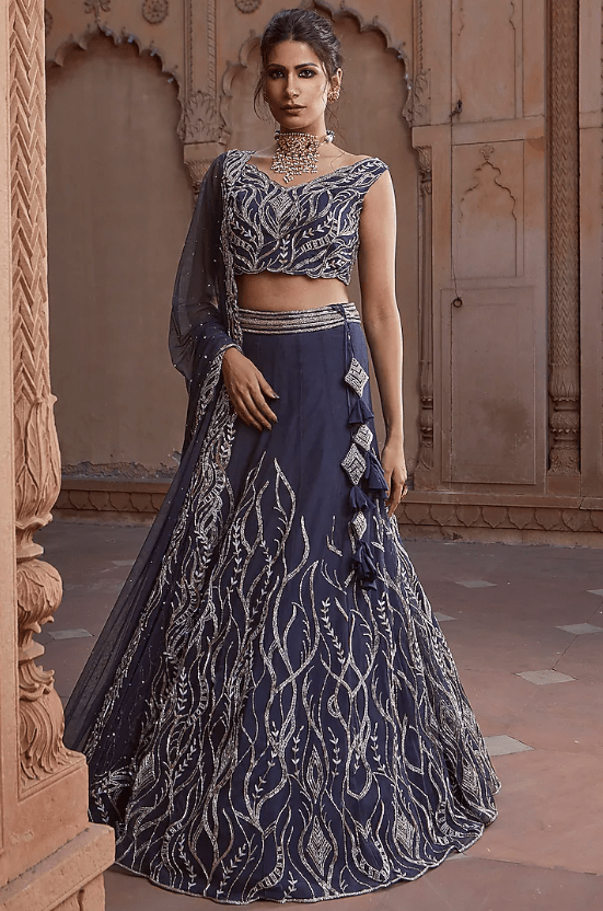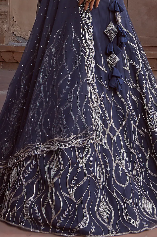Featuring a medieval blue lehenga in net base with hand embroidered curvy lines. It is paired with a matching blouse and a dupatta.
