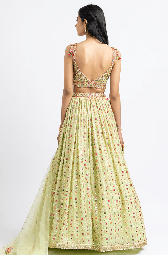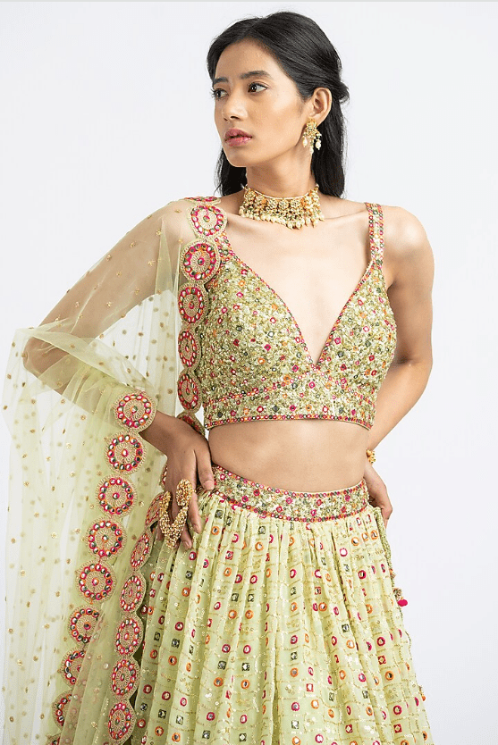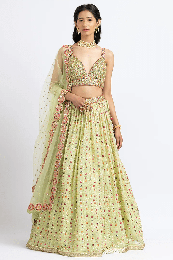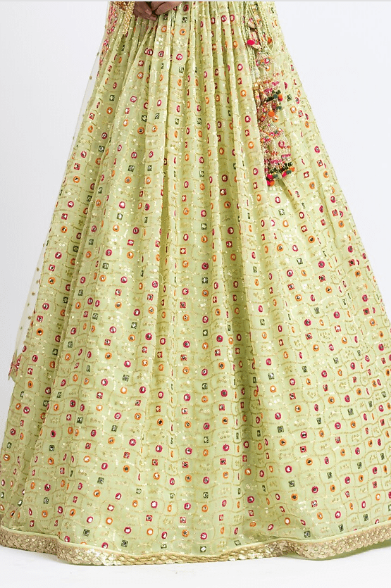 mehendi green lehenga in georgette base. It is paired with a matching tulle blouse and a dupatta having multi-colored resham, sequins, and patra embroidery. Accentuate this lehenga set with statement jewellery and for a wedding or an engagement ceremony