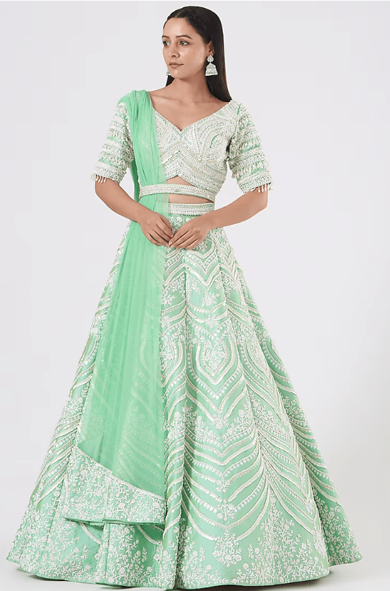 Featuring a mint lehenga in silk taffeta base with pearls, cutdana, and glass beads embroidery. It is paired with a matching blouse, belt, and a soft net dupatta.