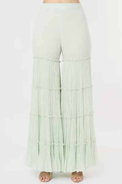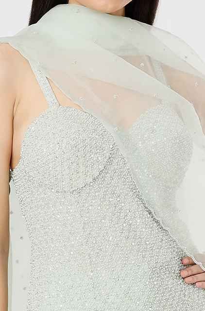 Featuring a mint kurta in organza and georgette base with embroidered checks. It is paired with matching gathered sharara pants having layers and a dupatta.