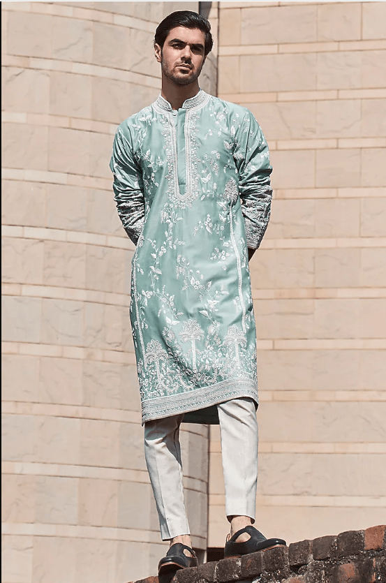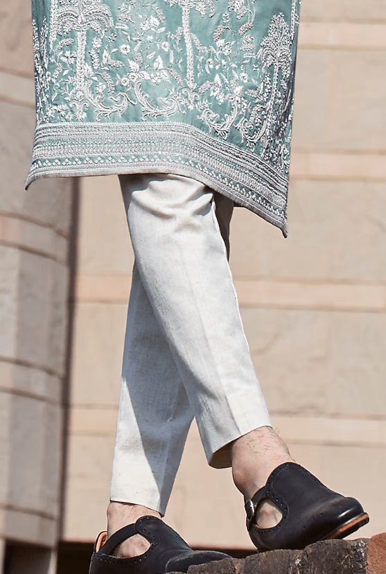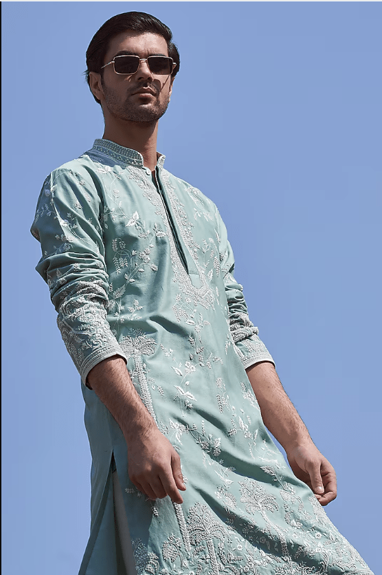 Featuring a mint green kurta in chanderi base. It is paired with cotton pants. Perfect attire for a festive occasion or pooja ceremony, exuding traditional charm and elegance.
