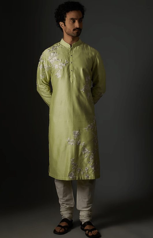 Featuring a mint green kurta in chanderi silk base with resham embroidery. It is paired with pants. Accessorize this kurta set with a pair of juttis for mehendi ceremonies or any festive occasion.