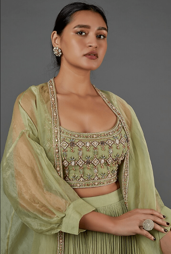 Featuring a mint green lehenga in chiffon base. It is paired with a matching blouse having embroidery and a cape.