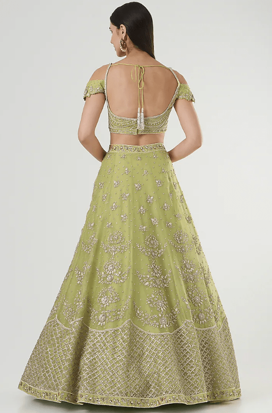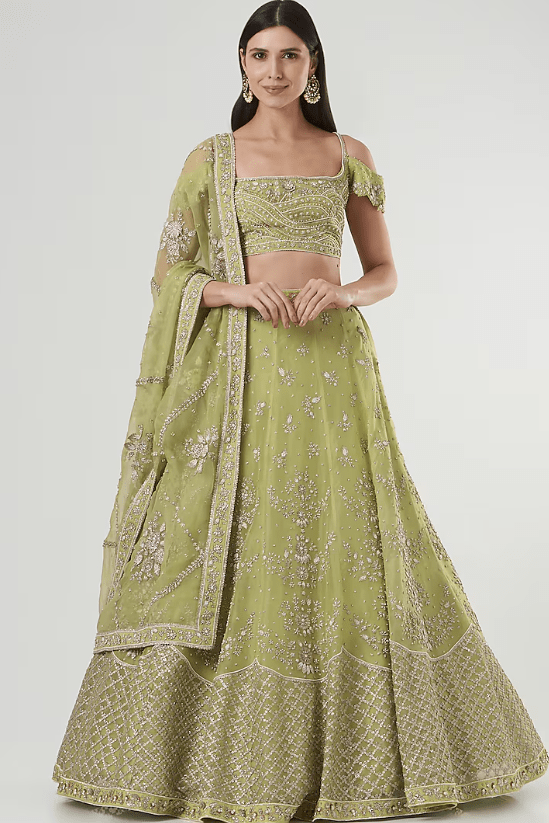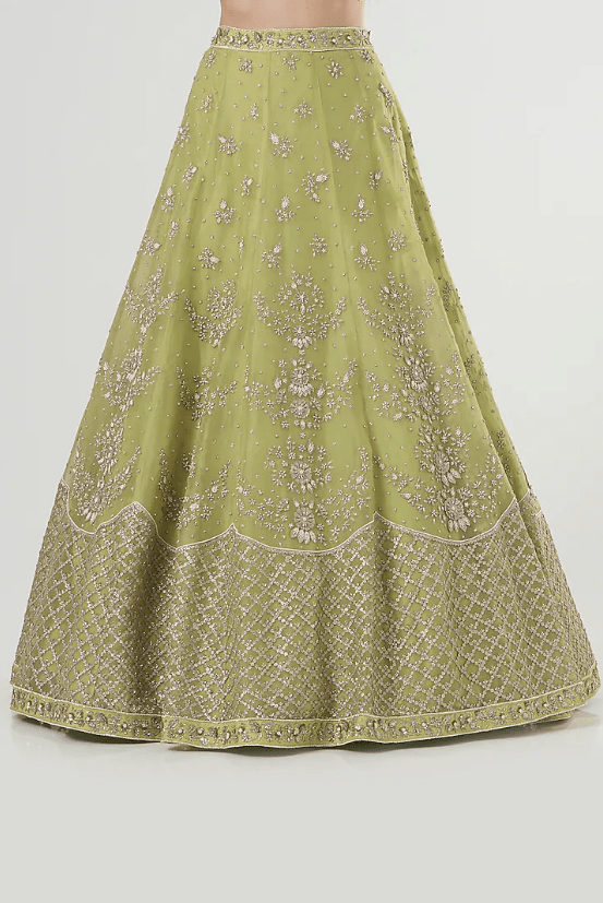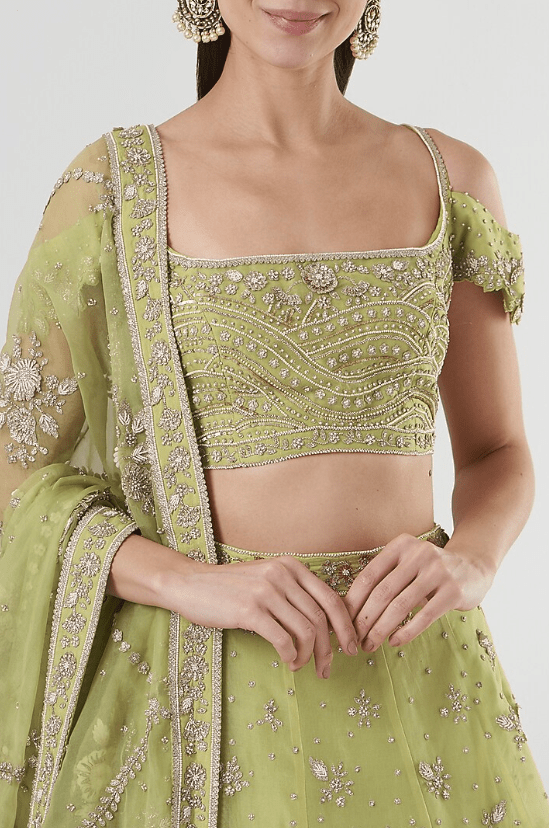 Featuring a mint green lehenga in organza base with 3D applique embroidery. It is paired with a matching blouse and a dupatta.