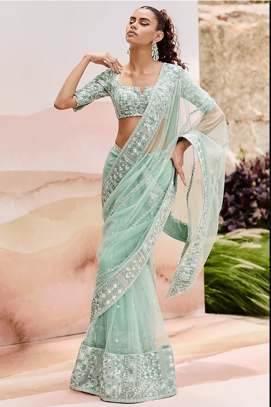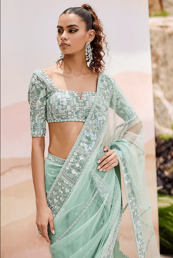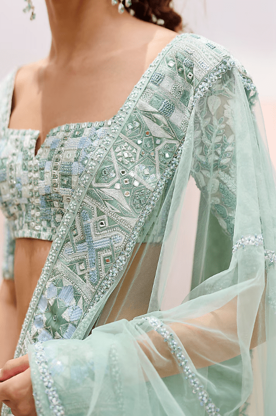 Featuring a mint green saree in tulle base with geometric embroidery. It is paired with an embroidered blouse and an underskirt. Accentuate it with zircon jewellery, an embroidered clutch and wedges for a graceful ethnic look, perfect for weddings, sangeet or mehendi functions.
