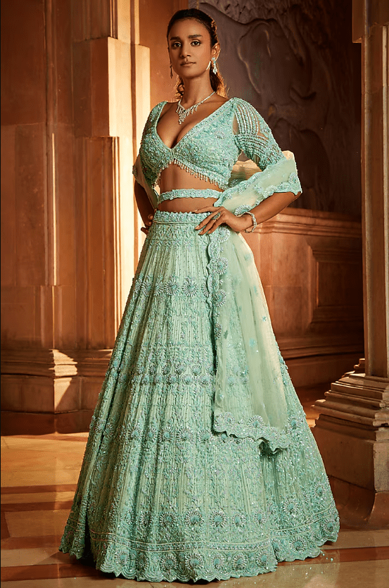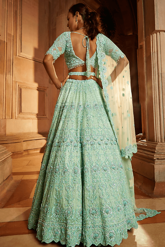 mint green lehenga in tulle base with silver sequins, beads, and crystals embroidery. It is paired with a matching blouse, a dupatta, and a belt. Accentuate this lehenga set with polki jewellery and heels for a perfect look for a wedding or engagement ceremony.