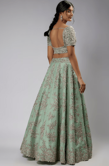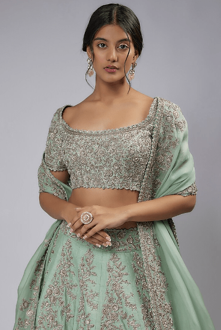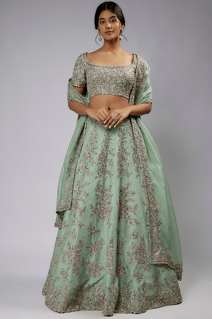 Featuring a mint lehenga in raw silk base with embroidery. It is paired with an embroidered blouse and a dupatta. Style it with ethnic dangler earrings and block heels for wedding ceremonies.