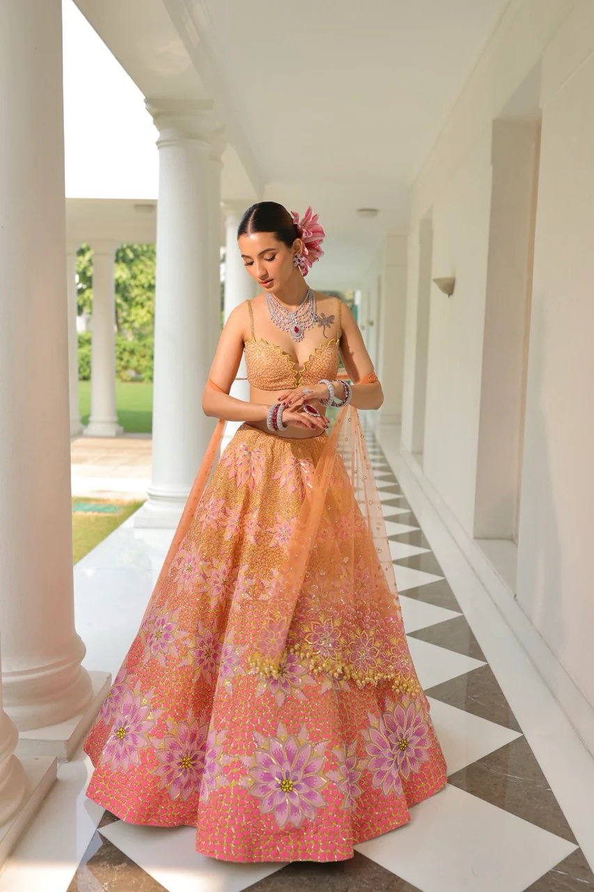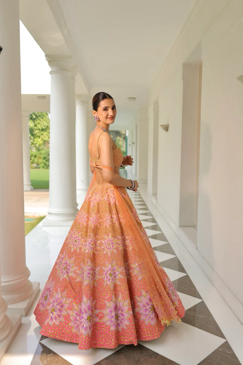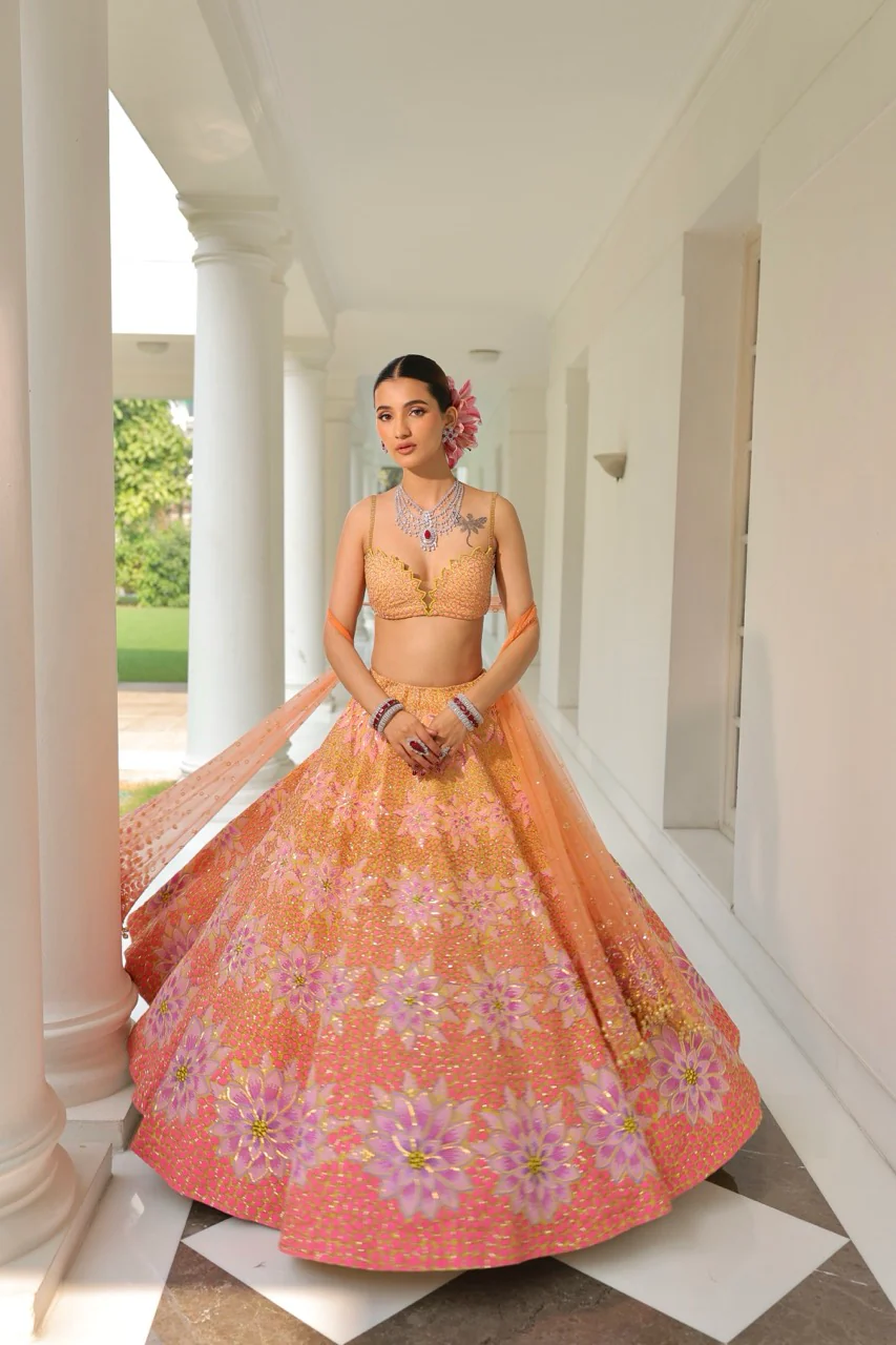 The Mohhar Blossom Lehenga showcases meticulous artistry, adorned with shaded flowers and sparkling stones in lush pink and orangish-peach tones. The blouse, adorned with golden beaded straps, complements a stylized dupatta that gracefully fades with nature’s finest elements, evoking the charm of a blossoming garden.