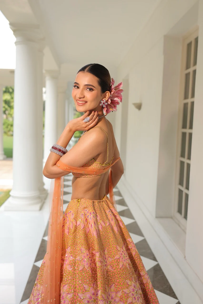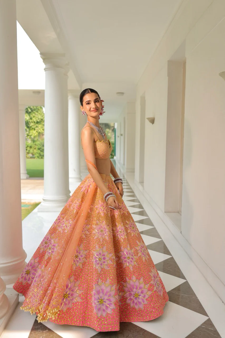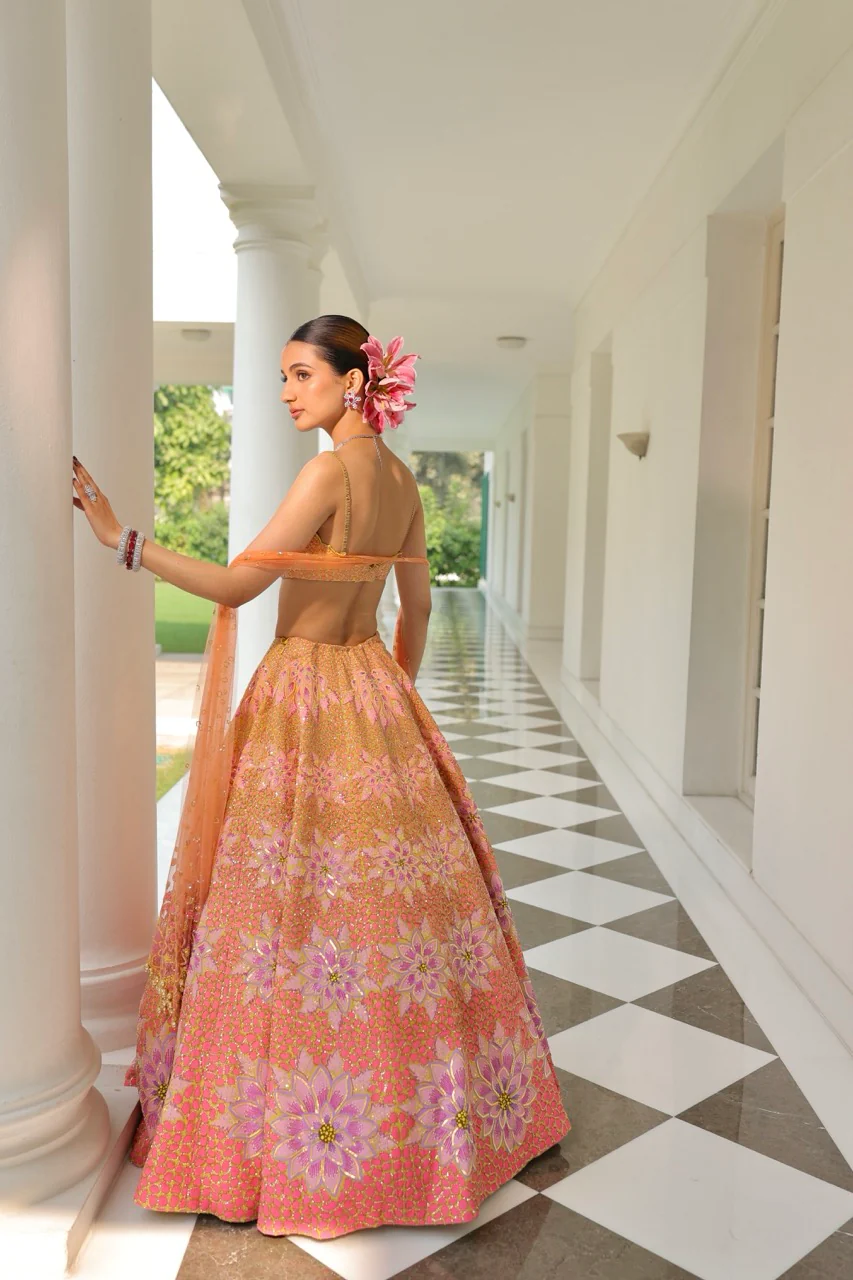 The Mohhar Blossom Lehenga showcases meticulous artistry, adorned with shaded flowers and sparkling stones in lush pink and orangish-peach tones. The blouse, adorned with golden beaded straps, complements a stylized dupatta that gracefully fades with nature’s finest elements, evoking the charm of a blossoming garden.