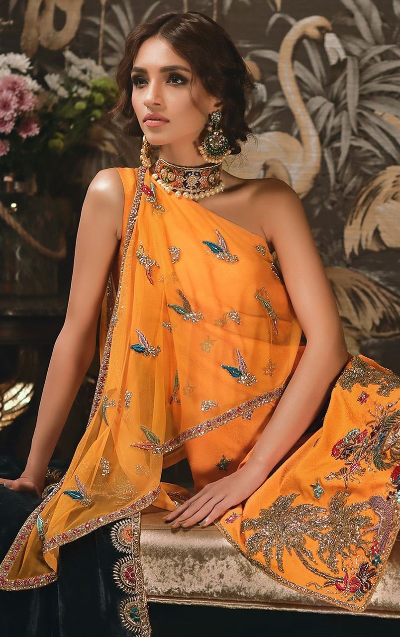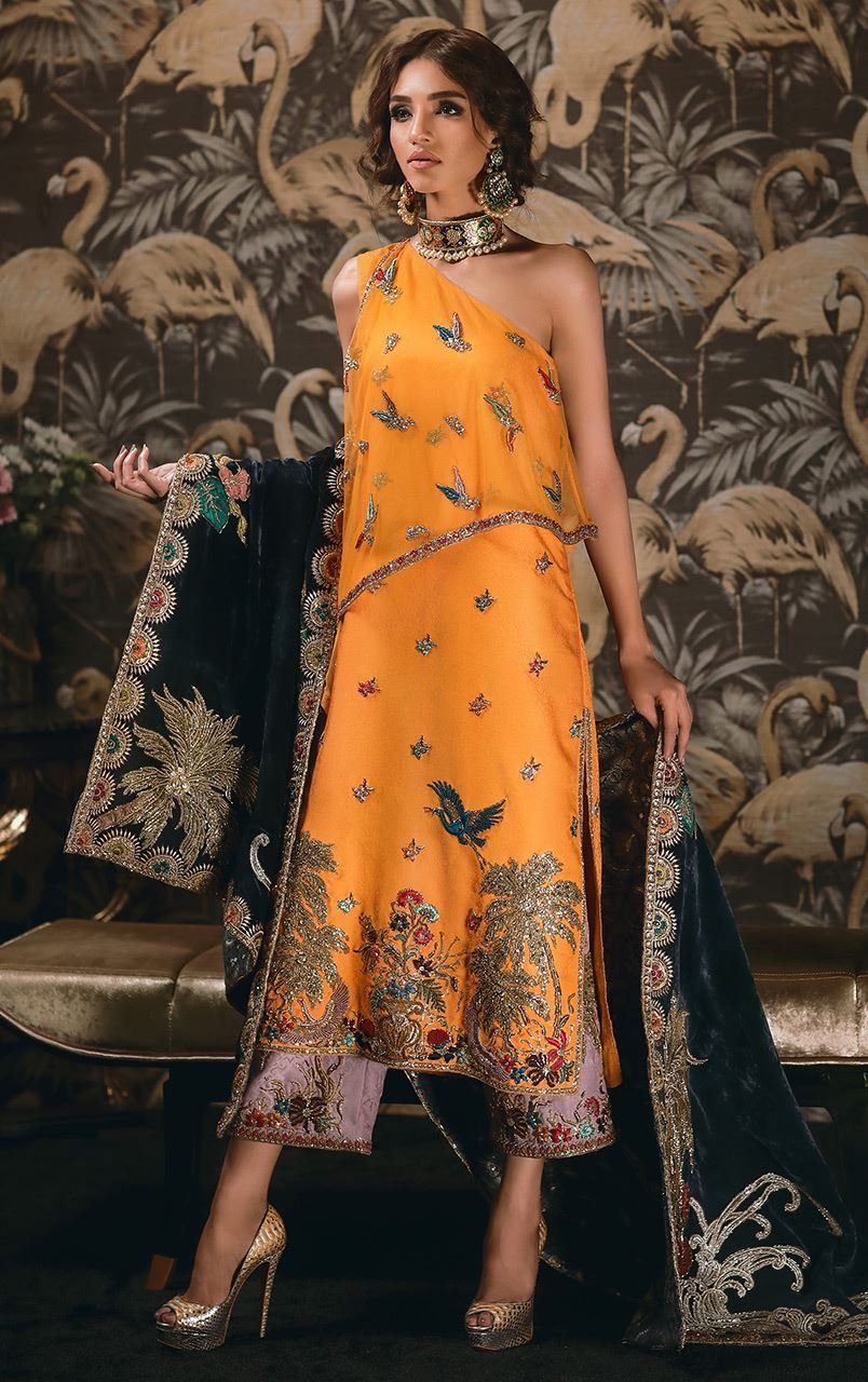 Orange one shoulder sleeveless long shirt with a net cape embellished with bootis. Handworked daaman with bird and floral motifs. Lilac culottes with handworked floral motifs and border. Dark blue velvet shawl with beautiful embroidery, applique and machine & handworked borders on all four sides.