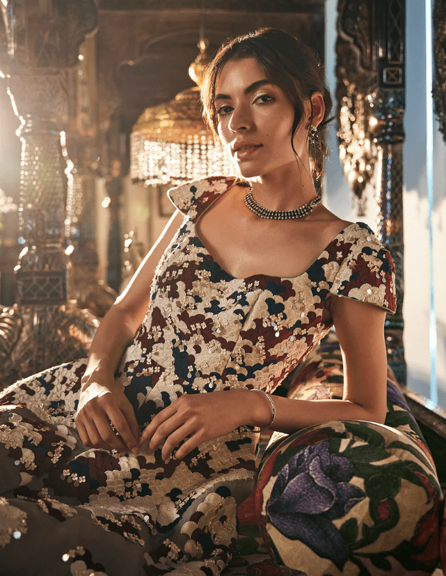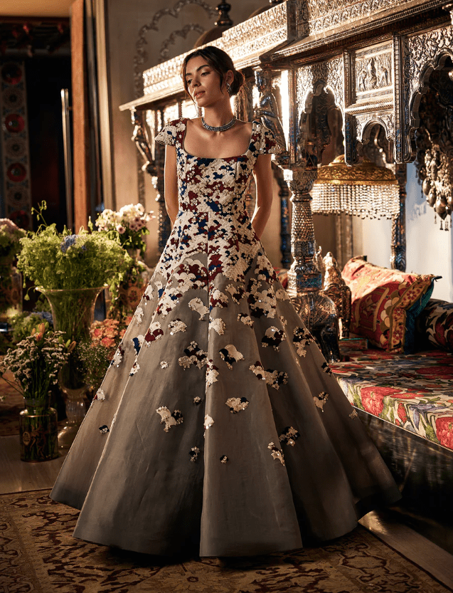 This classic ball gown features a stunning combination of applique and hand embroidery, offering timeless elegance with an artistic touch.