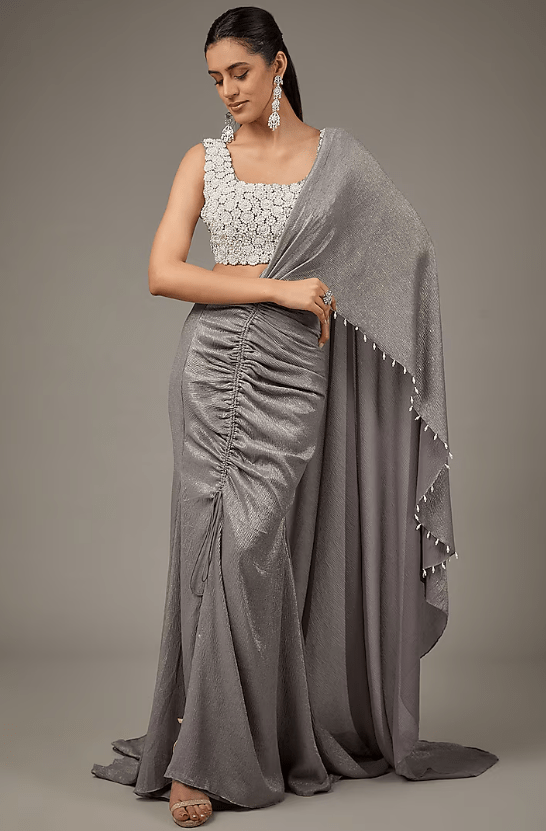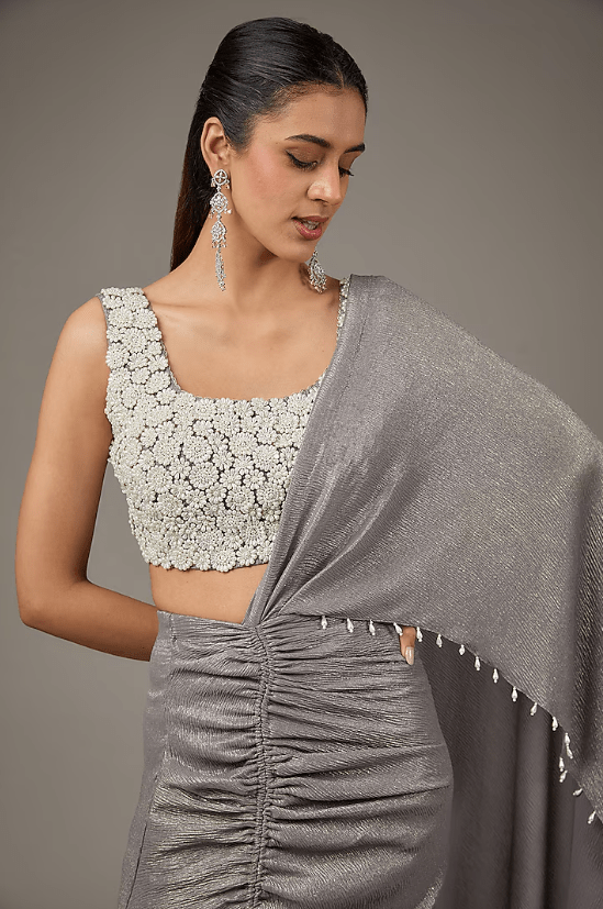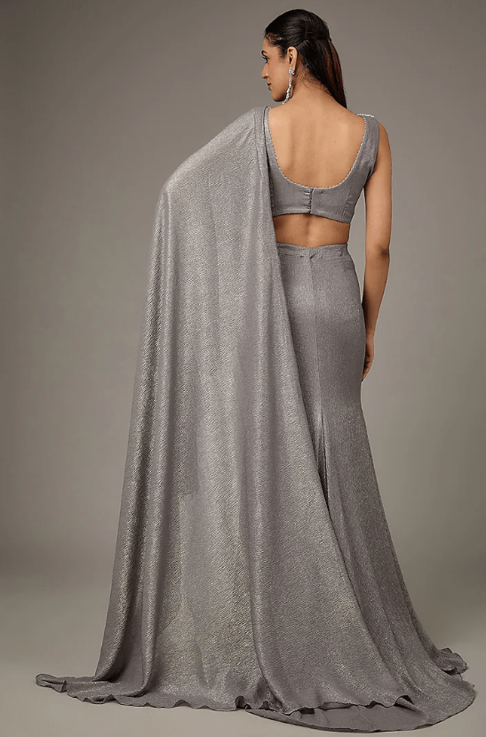Featuring a mud saree in shimmer chiffon base. It is paired with an embroidered blouse. Accentuate it with dangler earrings and heels for a cocktail or sangeet ceremony.