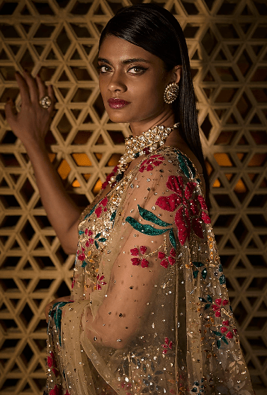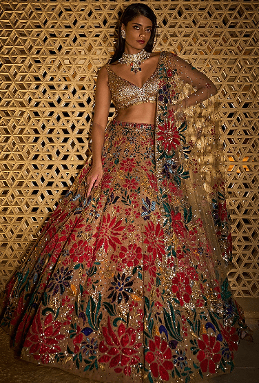 Featuring a multi-colored floral lehenga in net base with sequins applique embroidery. It is paired with a matching blouse and a dupatta.