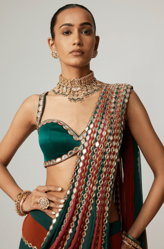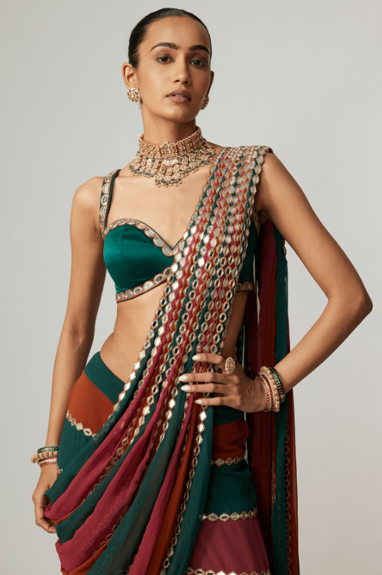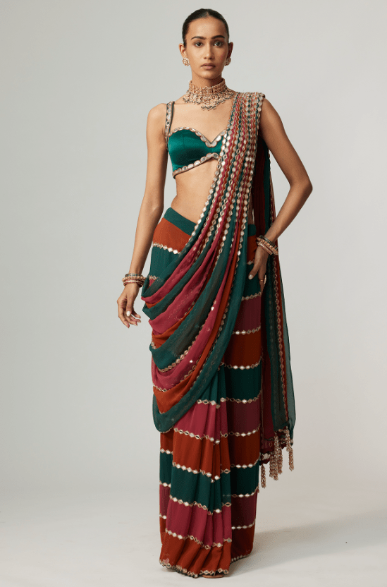 Featuring a multi-colored saree in georgette base with mirror embroidery. It is paired with a satin blouse. Accentuate with dangler earrings and heels for a festive occasion.