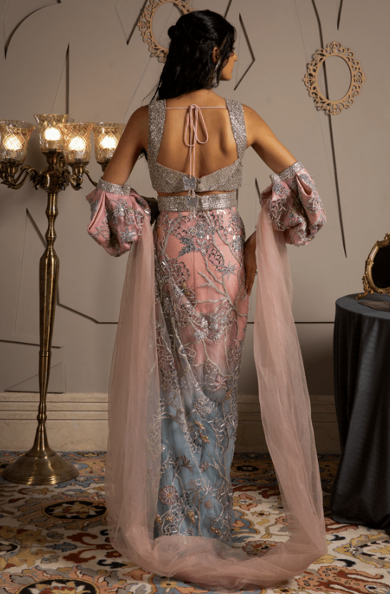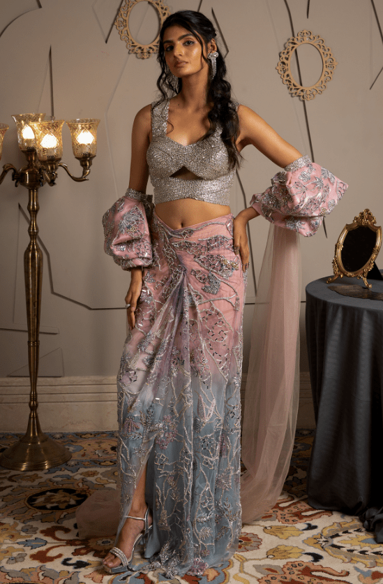 Featuring a multi-colored ombre pre-draped saree in shimmer net base with pearl and cutdana embroidery. It is paired with a butterfly net blouse having a pair of sleeves with attached dupatta . Accentuate it with statement jewellery and heels for a cocktail or sangeet ceremony