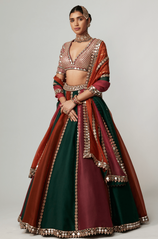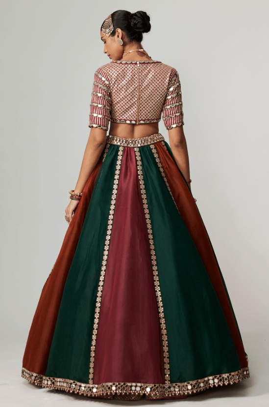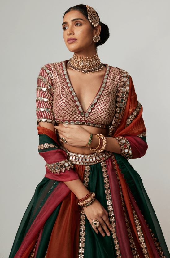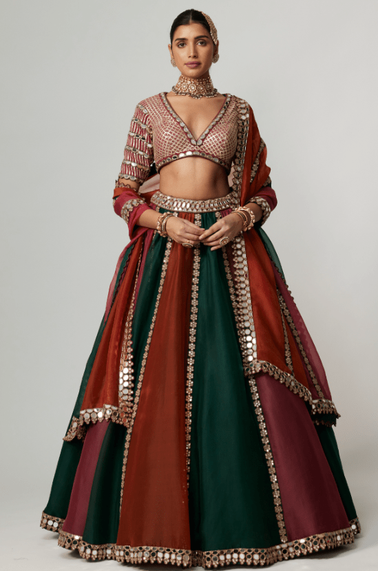 Featuring a multi-colored lehenga in organza base with golden gota embroidery. It is paired with an embroidered georgette blouse and an organza dupatta. Accentuate the designer lehenga with statement jewellery and heels for your wedding or engagement ceremony.