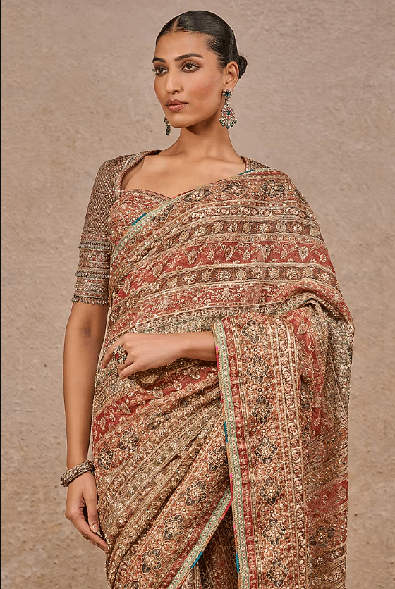 multi-colored saree in tissue georgette base with kashida hand embroidery. It is paired with a silk dupion blouse. Accentuate it with statement jewellery and heels for a wedding, sangeet or engagement ceremony.