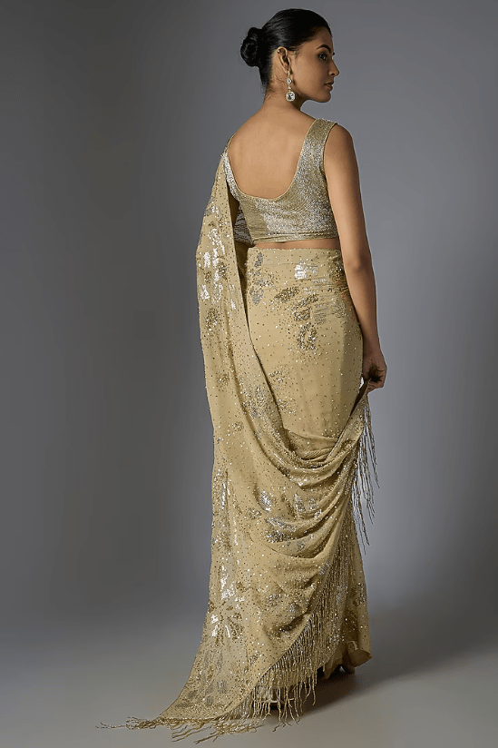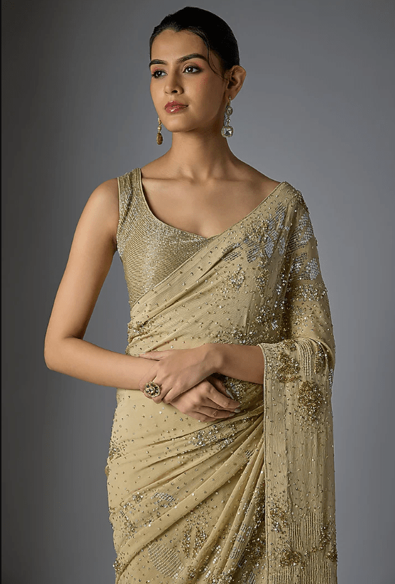 Featuring a mushroom saree in chiffon base with sequins embroidery. it is paired with a blouse. Accentuate with statement jewellery and heels for a wedding ceremony or festive occasions.