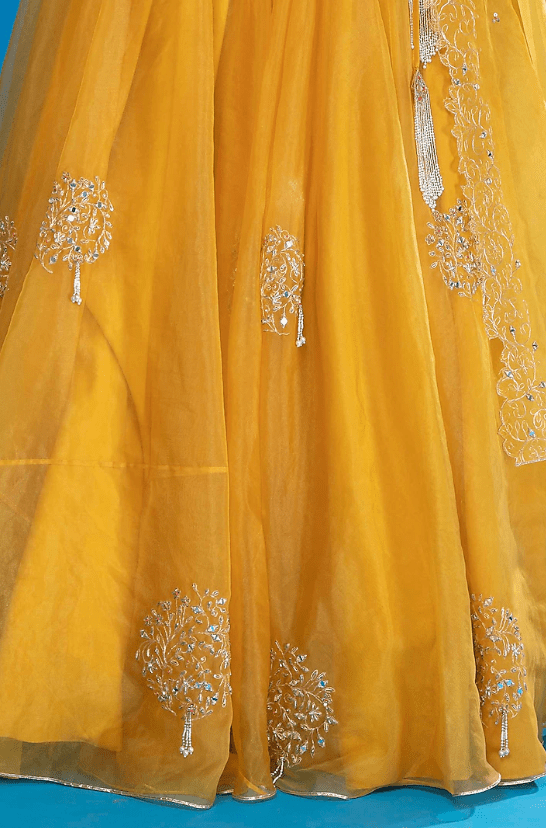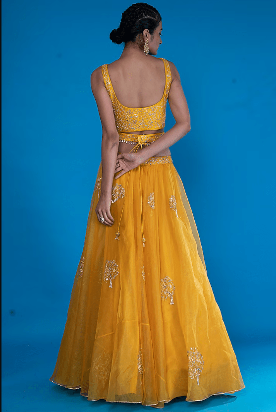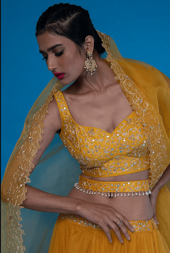 Featuring a mustard lehenga in organza base with embroidery. It is paired with a matching silk blouse, a belt, and a dupatta.