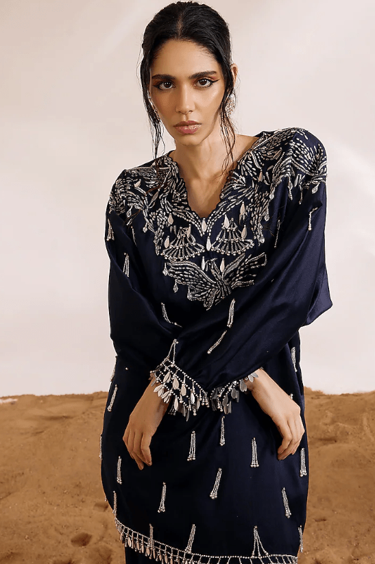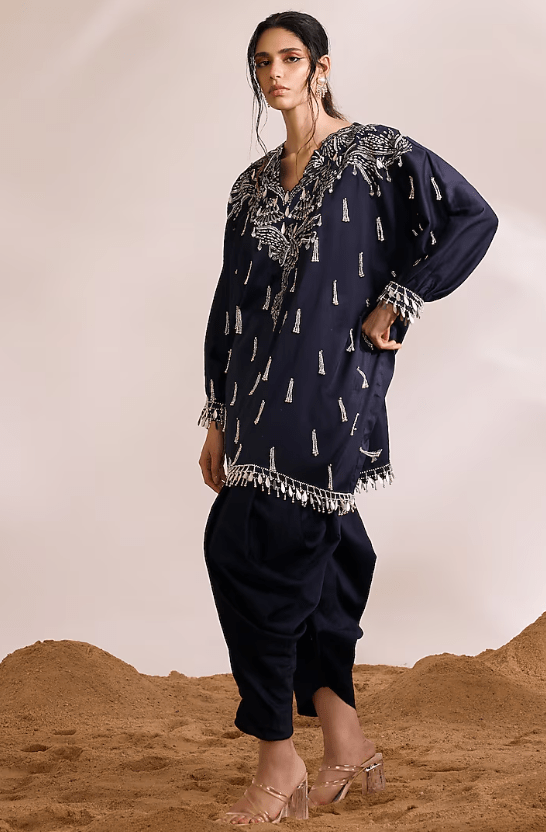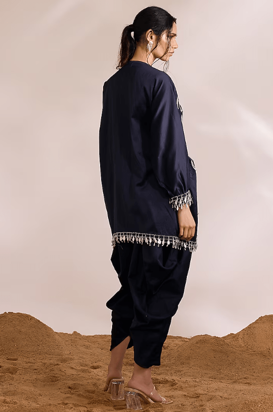 Featuring a navy blue kaftan in chanderi silk base with embellishment and pearl tassel detail. It is paired with dhoti pants. Accentuate it with statement jewellery and heels for festive occasions.
