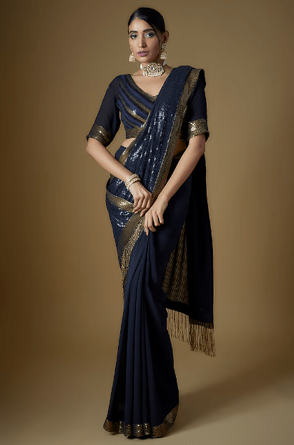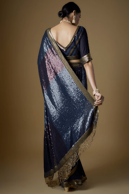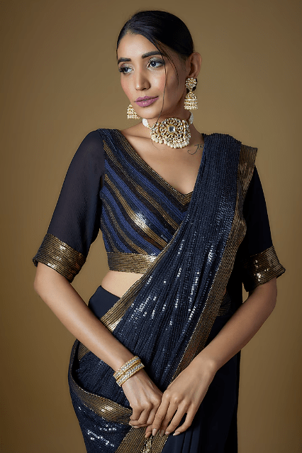 Featuring a navy blue saree in chiffon base with sequins embroidery. It is paired with a matching sequins striped blouse.