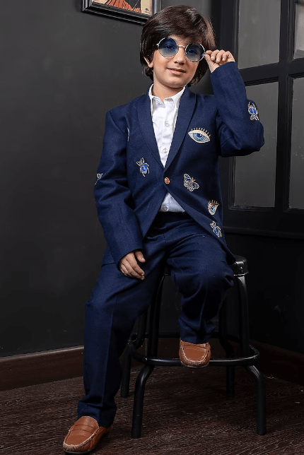 Featuring a navy blue blazer in denim base with embroidery. It is paired with matching pants.