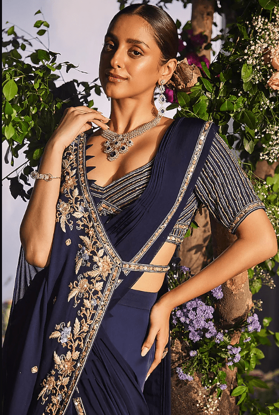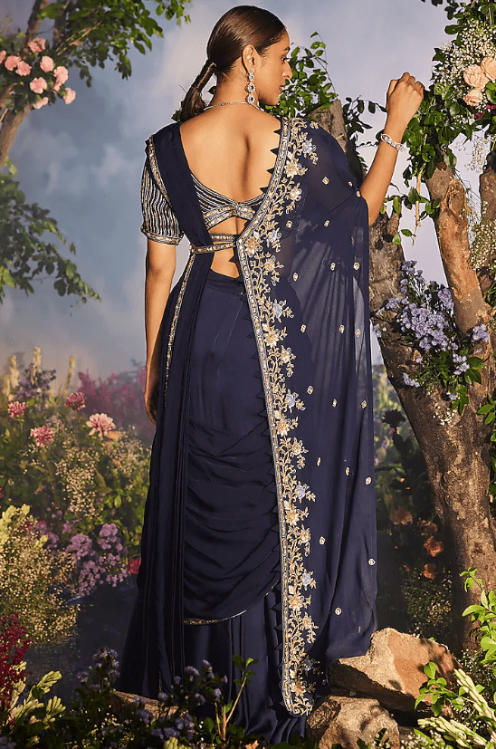 Featuring a navy blue draped lehenga saree in georgette and satin organza base. It is paired with a blouse and a cape having thread, sequins and cutdana embroidery. Accentuate statement jewellery and heels for an engagement or wedding ceremony.