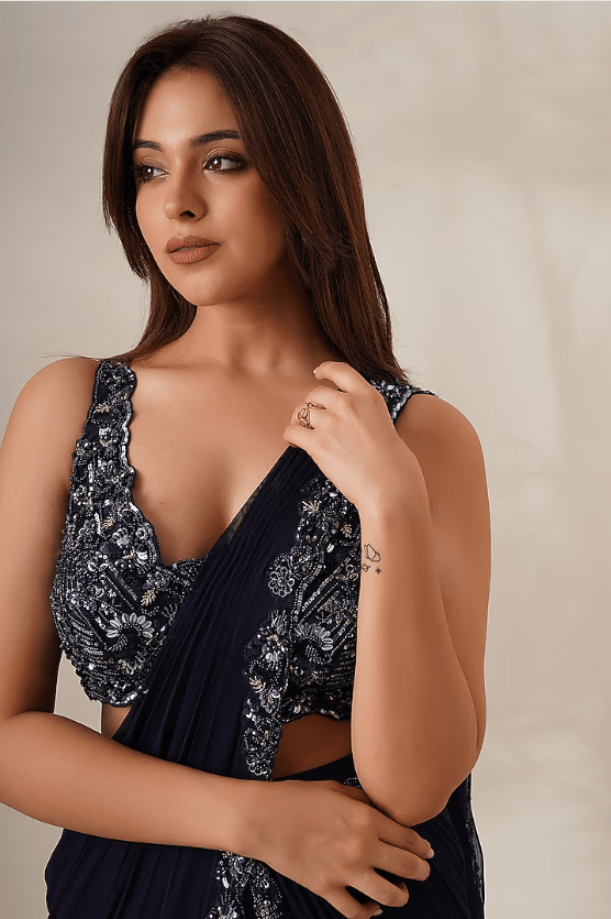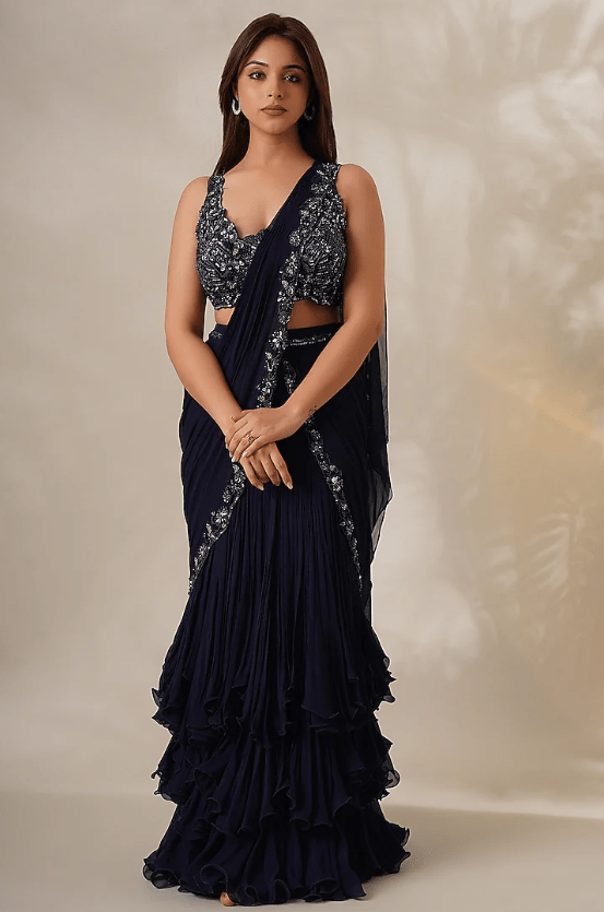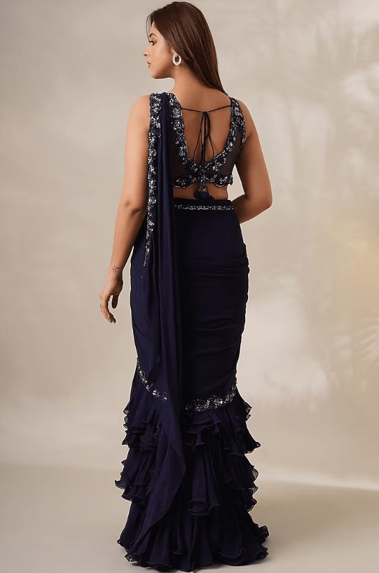 Featuring a navy blue draped saree in georgette base. It is paired with a matching blouse having pearl, sequins, and cutdana embroidery. Style this saree set with swarovski danglers and metallic stilettos.