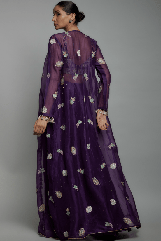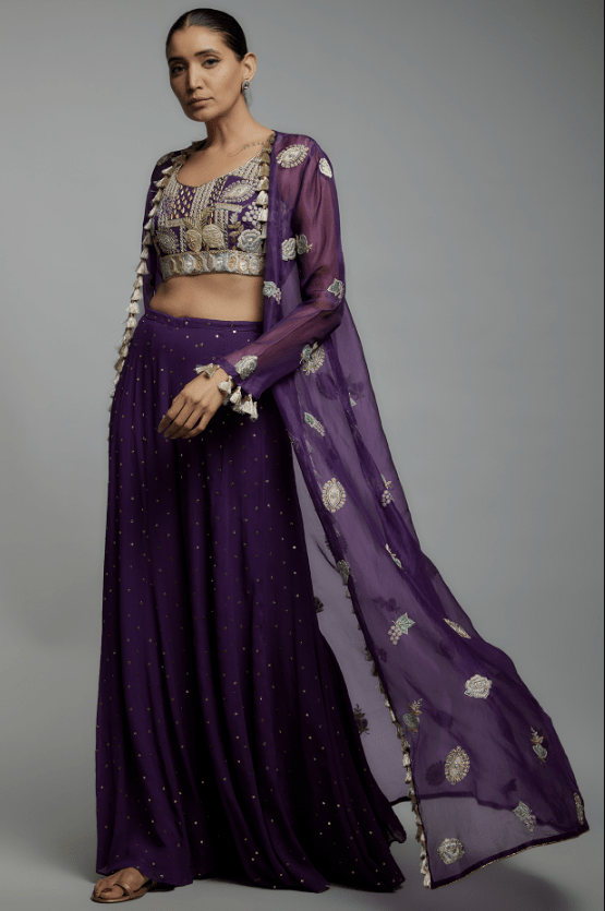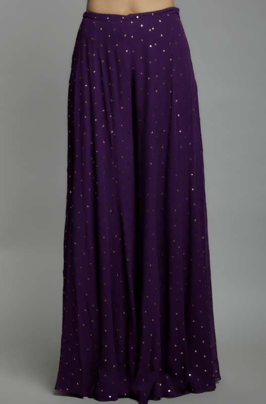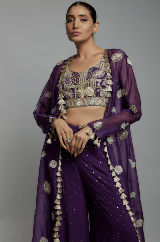 Featuring a navy blue frilled jacket in georgette base with print and embroidery. It is paired with a crepe top and palazzo pants. Accentuate it with statement earrings and heels for a festive occasion or sangeet ceremony.