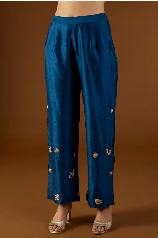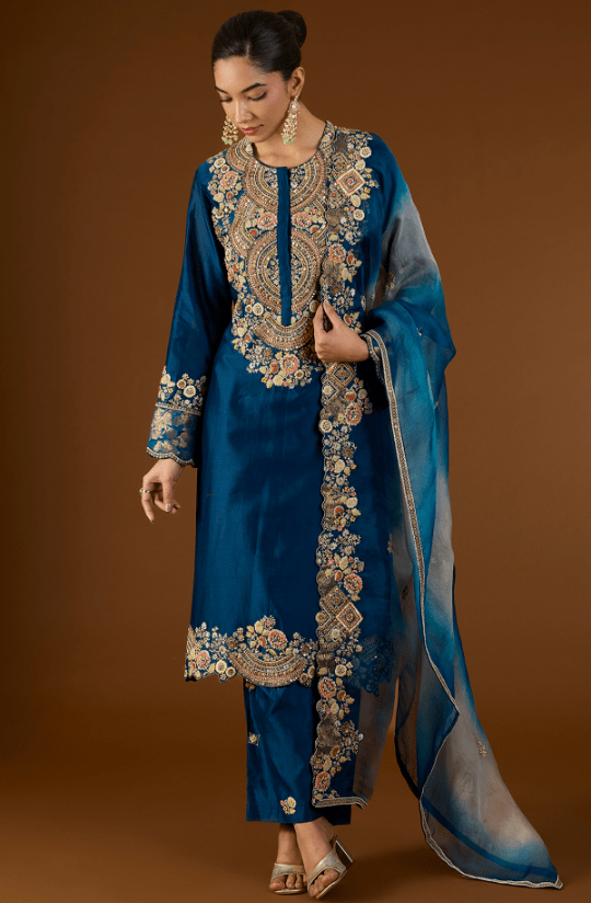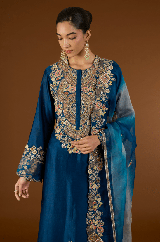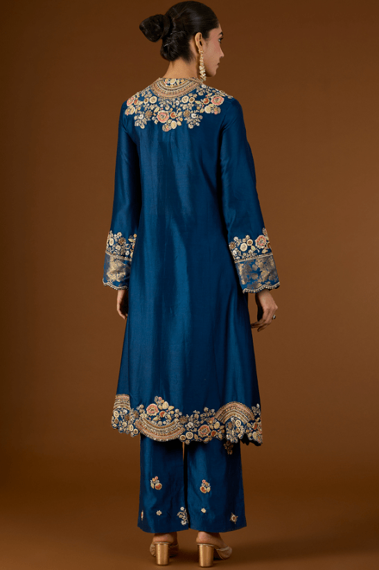 Featuring a navy blue short kurta in shimmer brocade organza base with hand and machine embroidery. It is paired with chanderi pants and an organza dupatta. Accentuate it with statement earrings and heels for a festive occasion.