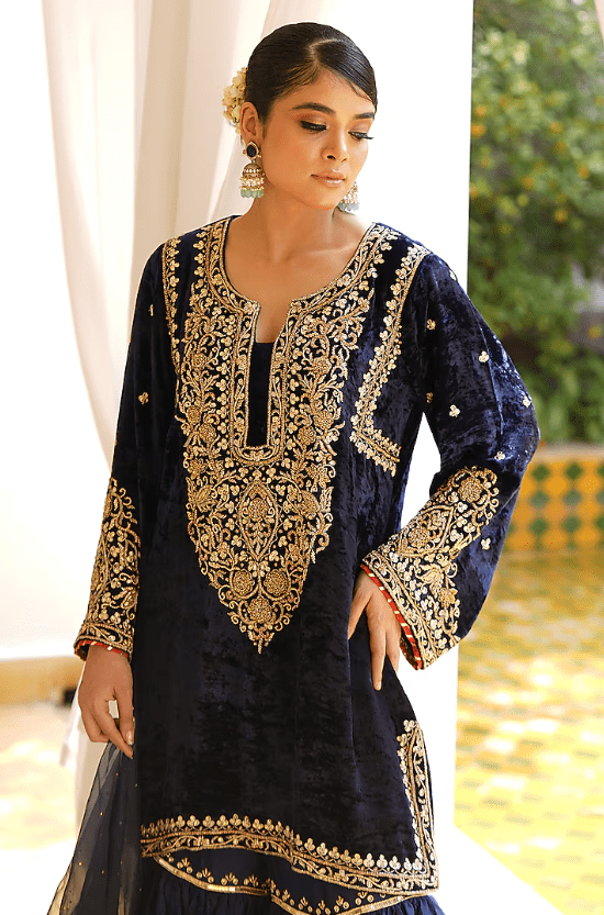 Featuring a navy blue kurta in velvet base with zarosi and aari hand embroidery. It is paired with satin silk gharara pants and an silk organza dupatta. Accentuate with statement earrings and heels for a festive occasion or sangeet ceremony.