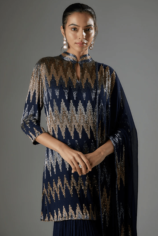 Featuring a navy kurta in chiffon base with sequins embroidery. It is paired with sharara pants and a dupatta. Accentuate it with statement chandbalis, metallic heels, and a potli bag for a glamorous look, perfect for weddings or festive celebrations.