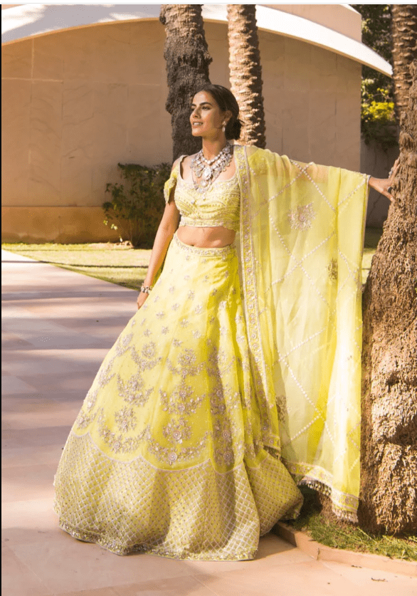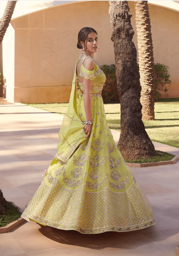 Lime Green lehenga set in light organza with signature Sahil Kochhar 3D appliqu?? embroidery teamed up with aesthetic cold-shoulder choli.