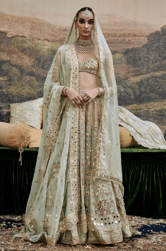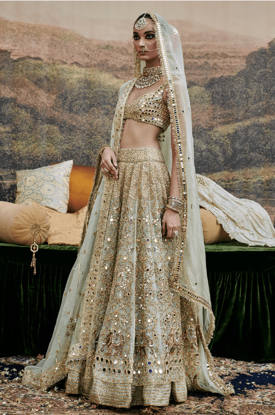 Powder blue organza Lehenga with mirror work and delicate elephant motif embroidery is done on the lehenga , paired with a mirror work blouse and organza dupatta with gota on border additional to the dupatta a veil is styled to complete the look.