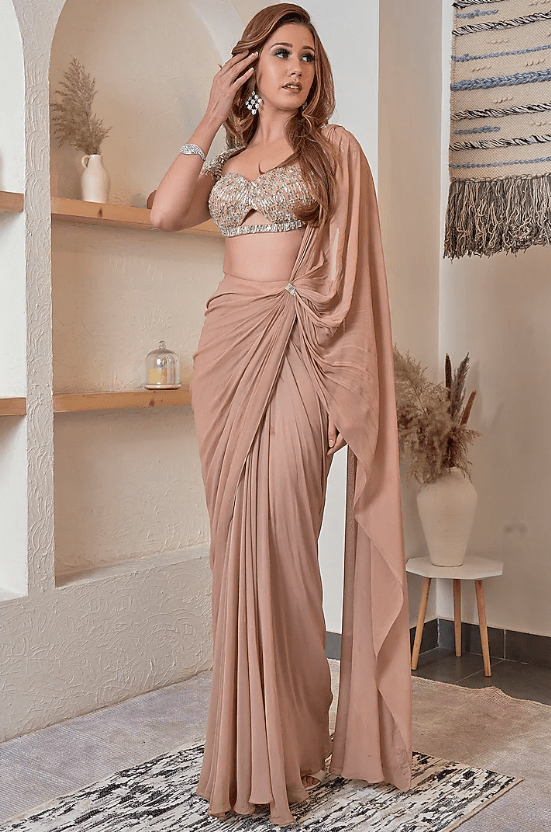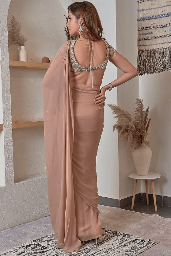 Nude Georgette Draped Saree Set