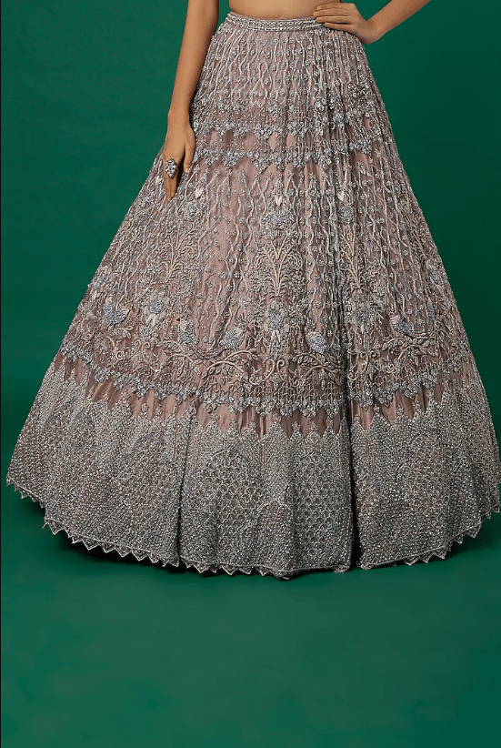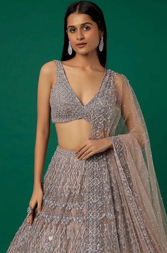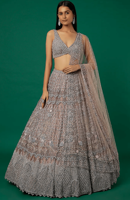 Featuring a nude grey lehenga in organza and tulle base with embroidery. It is paired with a matching blouse and a dupatta.